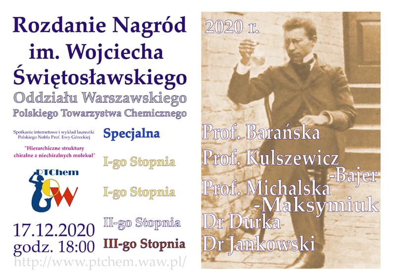 Oddział Warszawski Polskiego Towarzystwa Chemicznego przyznaje Nagrodę im. Wojciecha Świętosławskiego za wybitne osiągnięcia naukowe w dziedzinie chemii. Celem Nagrody jest wspieranie i propagowanie działalności badawczej chemików z regionu warszawskiego. Nagrodę po raz pierwszy przyznano w 2013r.