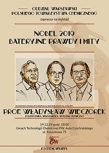 Władysław Wieczorek – Nobel 2019 – bateryjne prawdy i mity 27 lutego 202516 grudnia 2019 przez Sławomir Ostrowski 19 grudnia, godz. 18:00, Gmach Technologii Chemicznej PW, Aula Czochralskiego, ul. Koszykowa 75 Nobel 2019 – bateryjne prawdy i mity Władysław Wieczorek Wydział Chemiczny Politechniki Warszawskiej Dowiedz się więcej